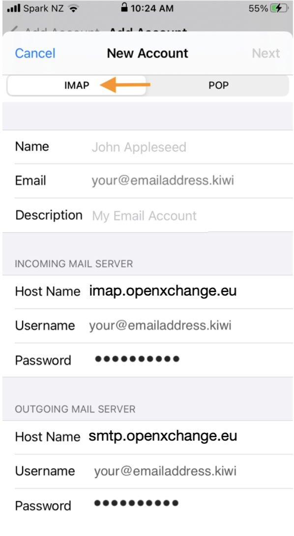 Make sure IMAP is selected and fill in all fields with the provided details.